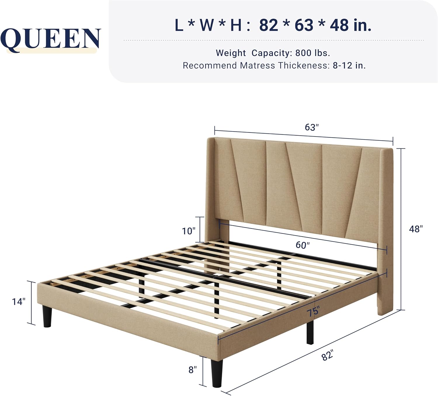 Comfortable Wingback Design: Lean back against the generously padded, 48-inch high headboard for exceptional comfort. Its elegant wingback design not only offers cozy envelopment but also securely keeps your mattress in place