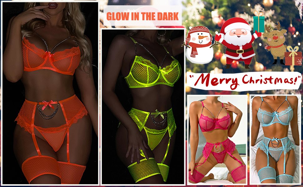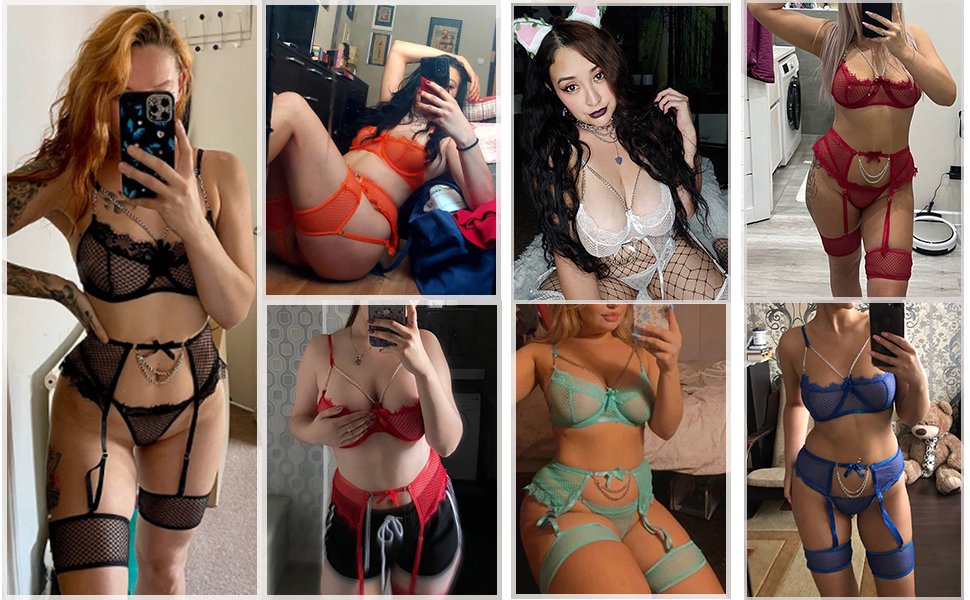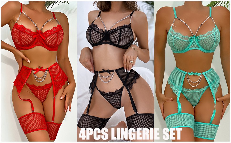 Beautiful eyelash trim of bra, panty and garterMetallic chain strappy strapsCute bow-knot decoratedSexy fishnet lace materialUnderwire bra for pushing upSoft texture, breathable, pores and skin pleasant, gentle weight,and so forth
