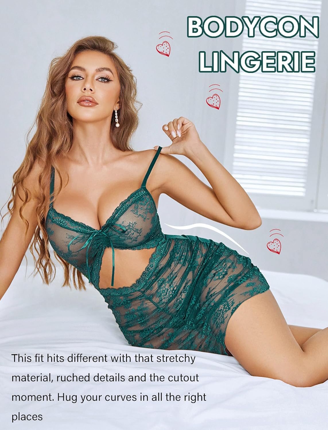 Avidlove Horny Lingerie for Girls Ruched Lace Babydoll Lingerie Cutout Mesh Bodycon Chemise Nightgown S-XXL
