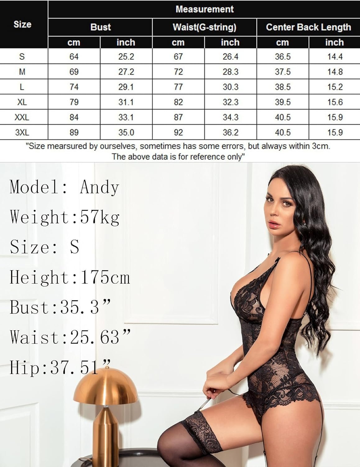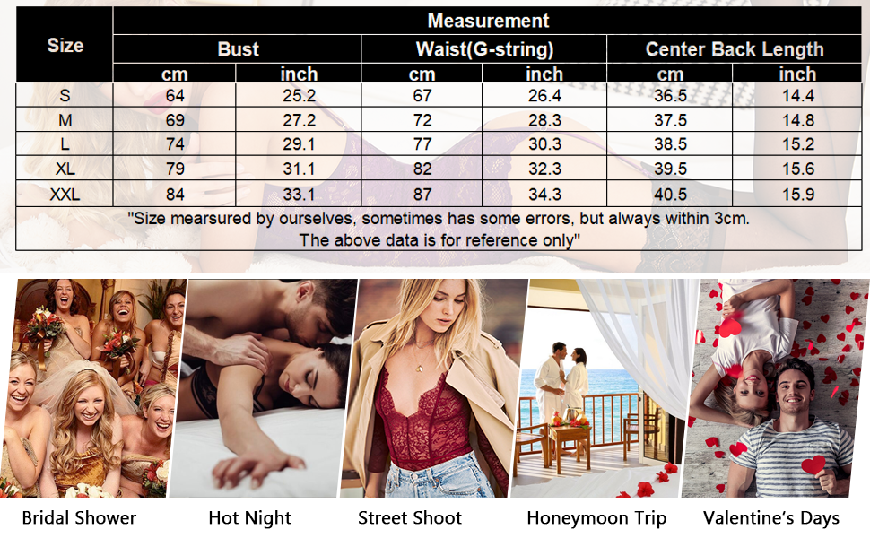 Horny Lingerie for Girls Lace Teddy Babydoll Bodysuit Nightwear Measurement Chart