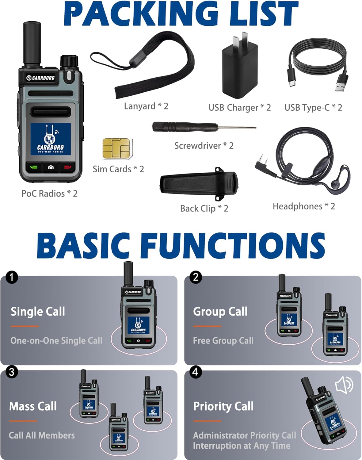 CARRBORG V1 Global 4G Walkie Talkie Long Range Handheld Unlimited Range Two Way Radios & 4000mAh Type-C Battery with SIM Cards(2 Pack)