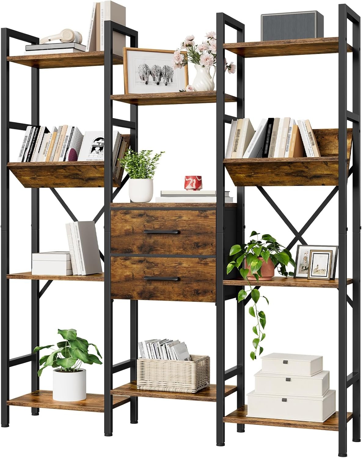 CHOEZON 3-Column Bookcase, 55.1″ Bookshelf with 2 Non-Woven Fabric Drawers and V-Shaped Shelves, Display Storage Shelf for Living Room, Office, Study, Rustic Brown and Black TSJ03BF