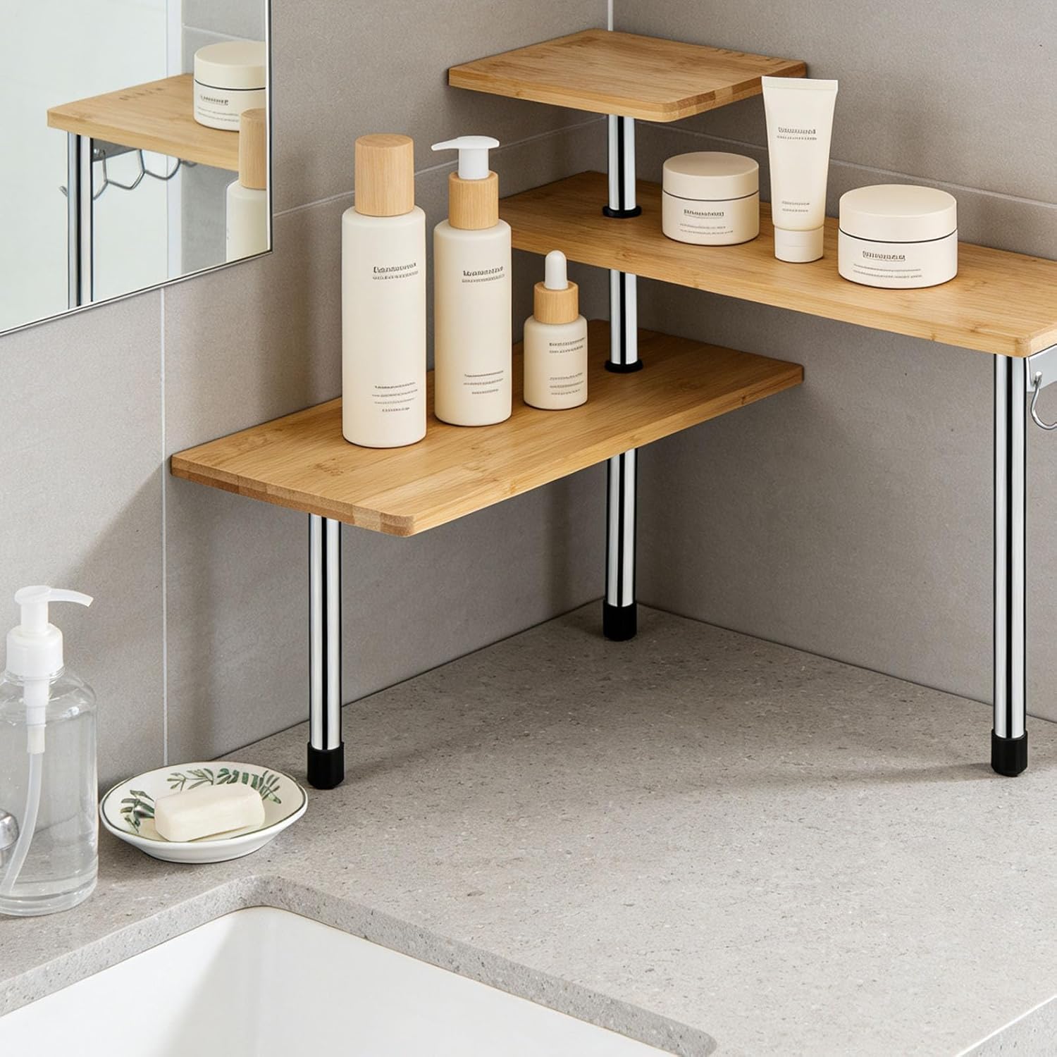 HYNAWIN 3-Tier Corner Shelf, Bamboo & Metal Storage Rack with Hooks, Adjustable Countertop Organizer for Kitchen, Bathroom, Bedroom or Office