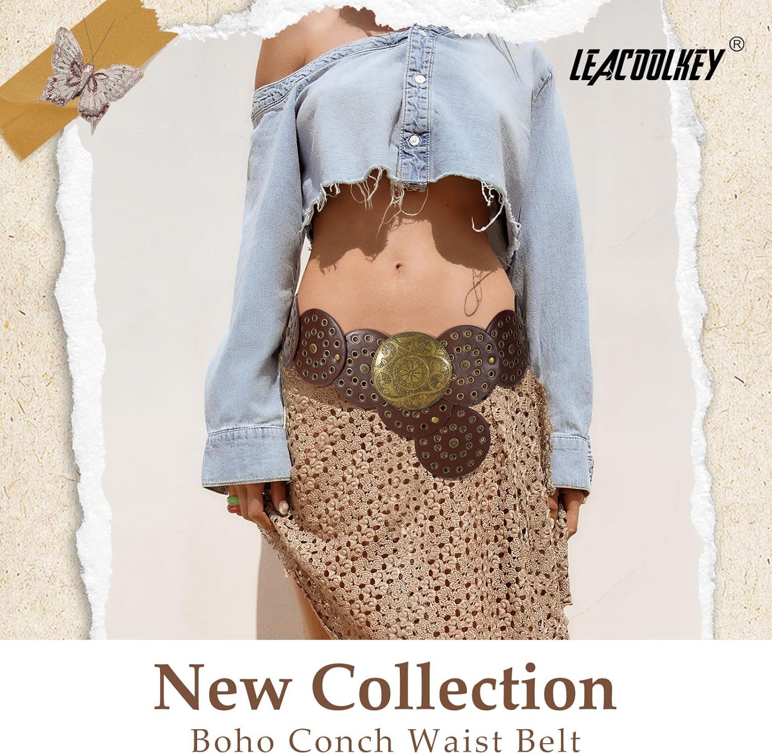 Ladies Western Leather-based Belt Boho Dics Conch Waist Belt for Costume Denims