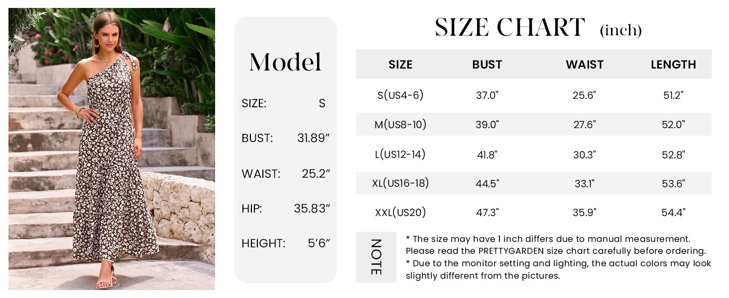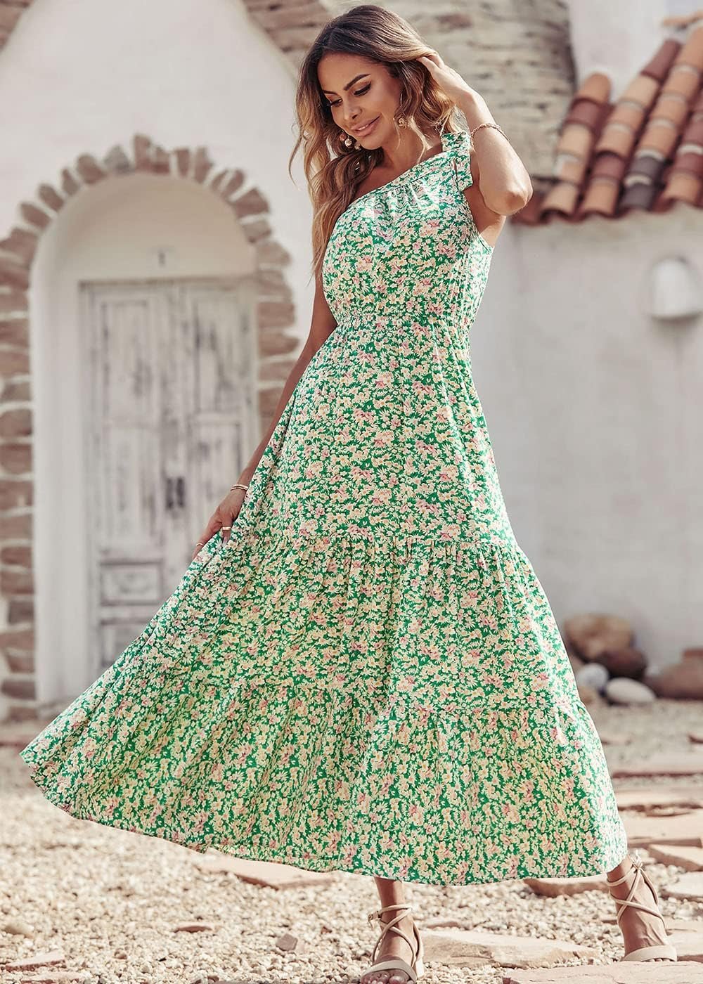 Trend Model: Sleeveless/Knot One Shoulder/Floral Print/Excessive Waist/Elastic Waist/Ruffled Hem/Ankle Size/Tiered Maxi Gown