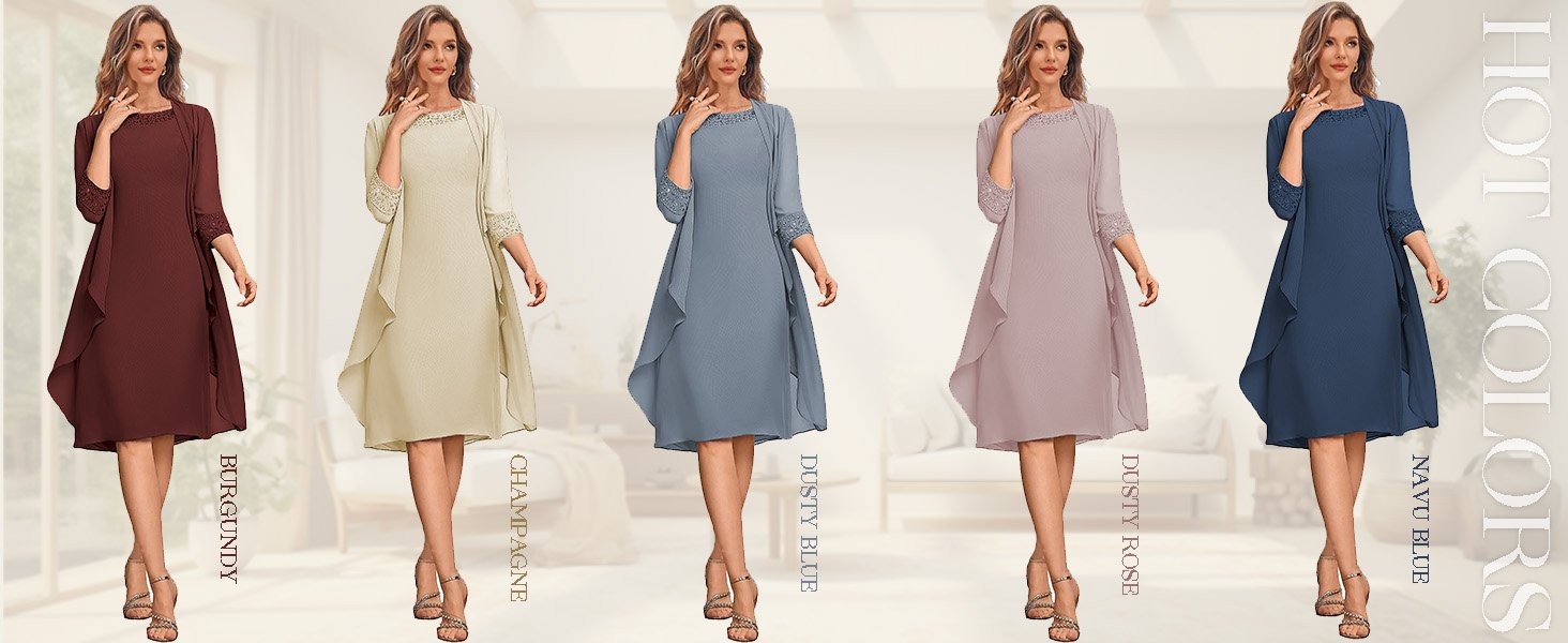 Chiffom mother of the bride dresses with jackets Features with chiffon beaded,3/4 long sleeve,scoop neck,a line,knee length,gorgeous enough to wear in any special occasion