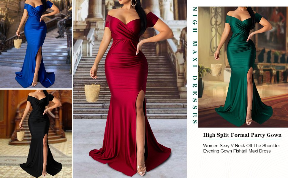Women Sexy V Neck Off The Shoulder Evening Gown Fishtail Maxi DressWomen Sexy V Neck Off The Shoulder Evening Gown Fishtail Maxi Dress