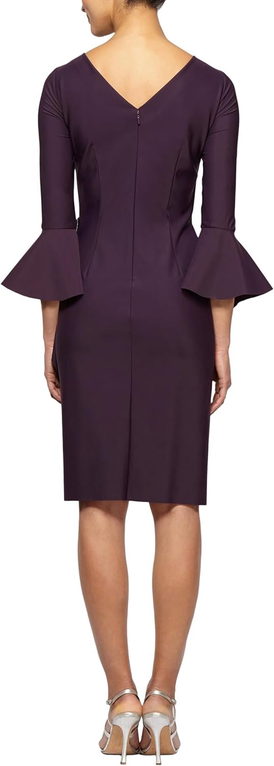 This bell sleeve cocktail dress features an embellishment at the hip and cascade ruffle detail skirt. It is made with smoothing and slimming fabric that enhances all the right places and is perfect for any special occasion.