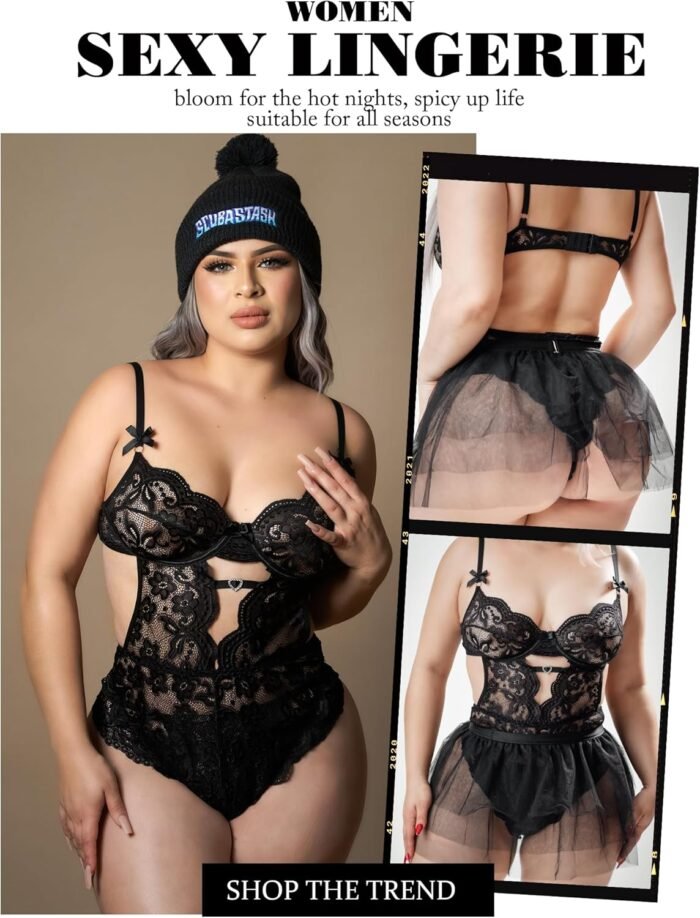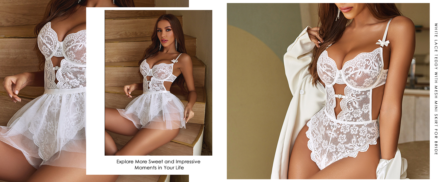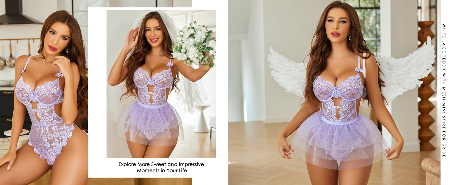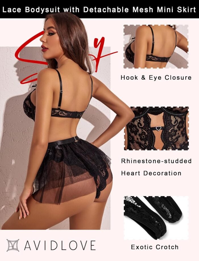 Avidlove Lingerie for Women Lace Bodysuit with Detachable Mesh Mini Skirt Push Up Teddy Lingerie Set