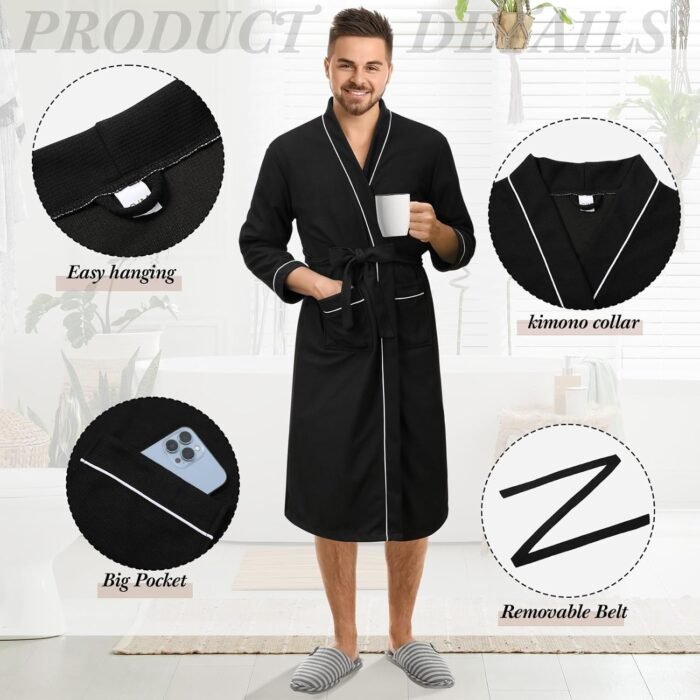 4 stars: Overall a basic mediumweight robe. It is not especially soft, and I’d call it more utilitarian than for lounging about, but maybe it’ll become less starchy after a few washes. It also has a distinct plasticky smell out of the package that an initial wash did not fully get out. However it has ample room in the pockets, something I am always a fan of. I am also a fan of the single white line on the otherwise black robe – I like the simple aesthetics of this. If you have long arms, the sleeves would probably be short for you. I happen to have short arms, so the fit was perfect. I would recommend a size up from your usual though. Overall, it’s definitely something I’ll continue using in the future!