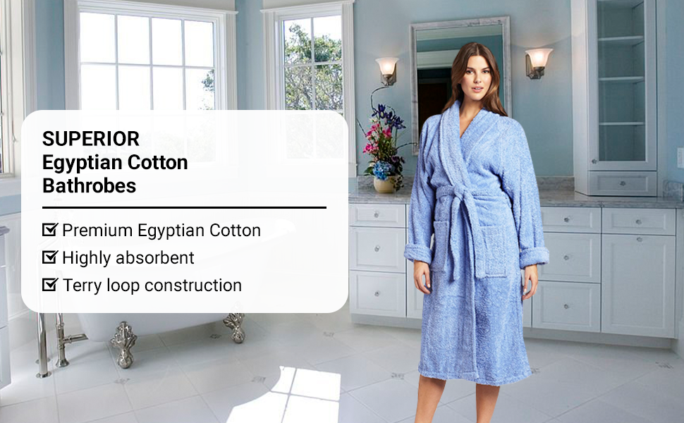 Feel like you’re being pampered at the spa with the ultra-soft Egyptian Cotton Terry Bathrobe. Egyptian Cotton is used for comfort, warmth, and absorbency. This unisex adult robe is tailored. Designed from premium Egyptian Cotton fibers, this gorgeous robe provides maximum comfort after stepping out of the shower or bath.