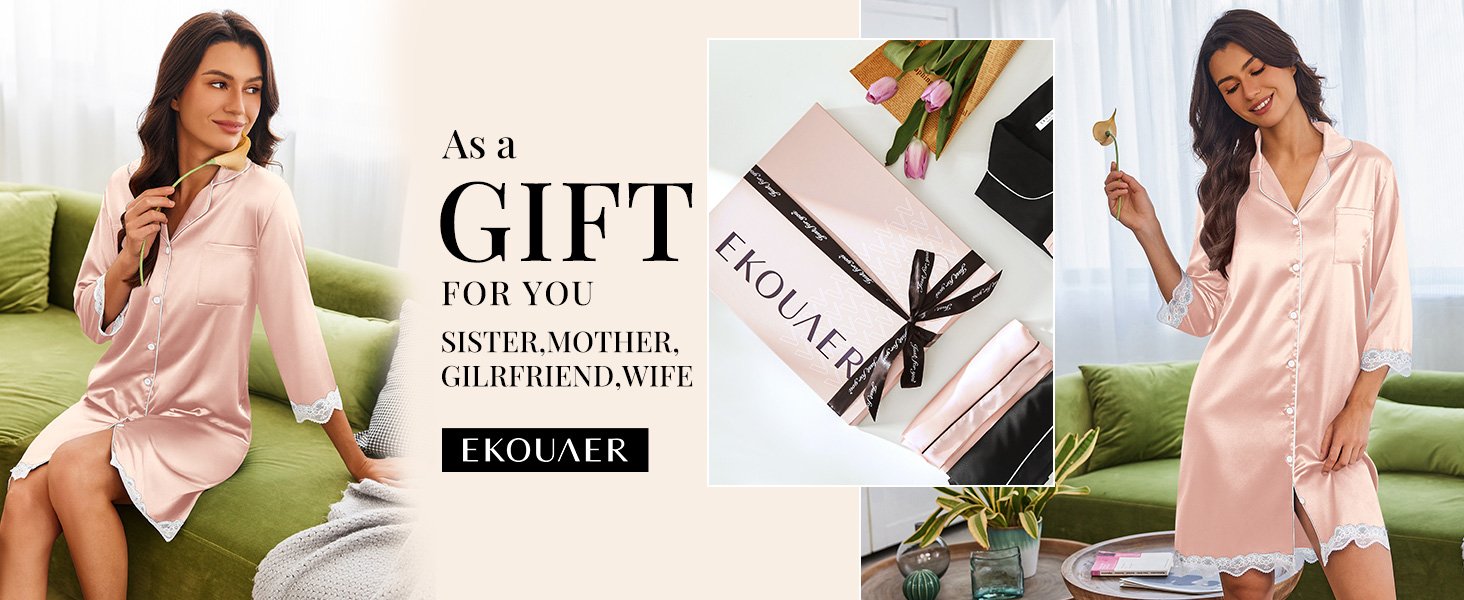 8 مراجعات لـ Ekouaer Satin Nightgowns for Women Button Down Sleepshirt 3/4 Sleeve Nightshirts Boyfriend Sleepwear