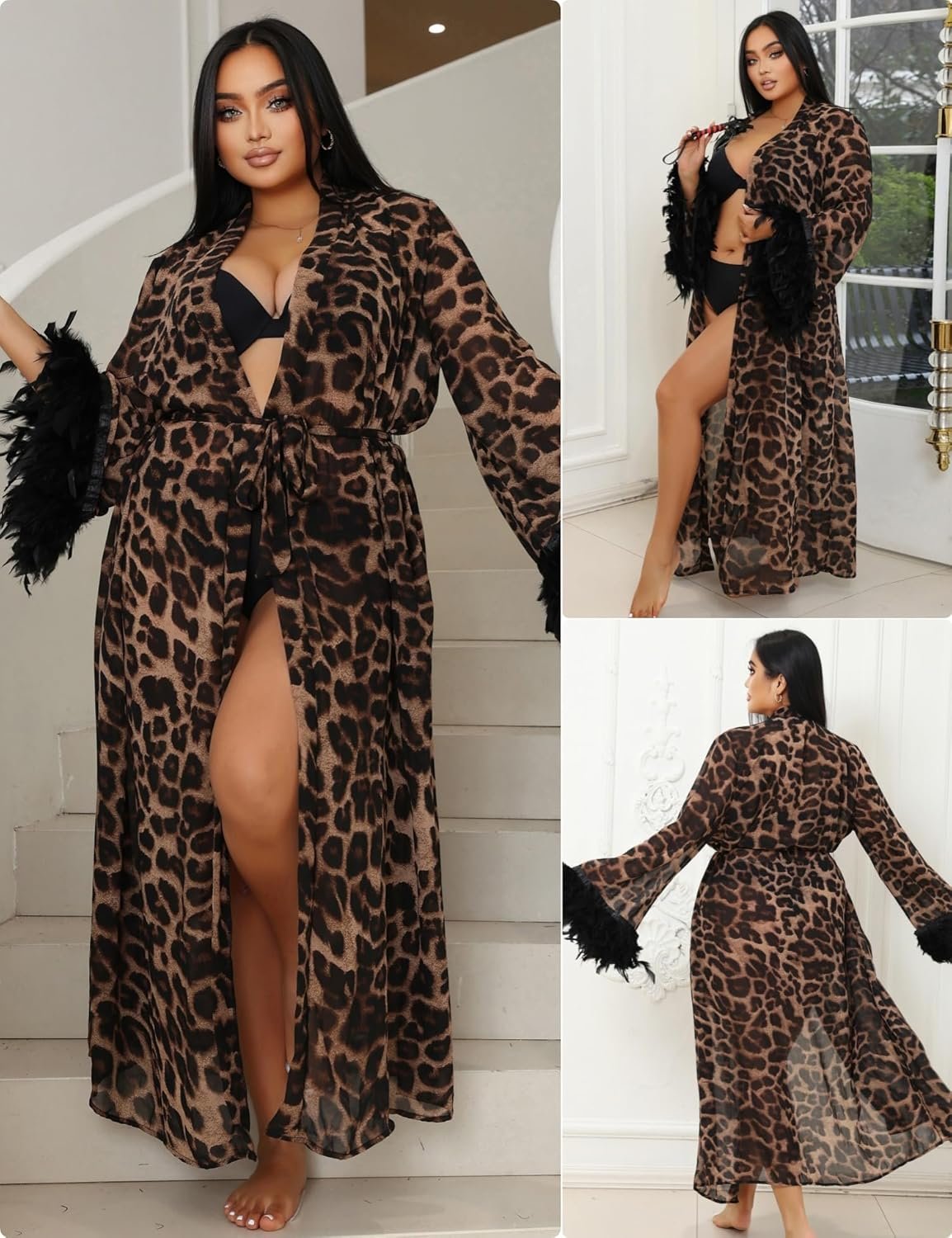chiffon fabric; Removable feather cuffs; Long kimono robe with belt