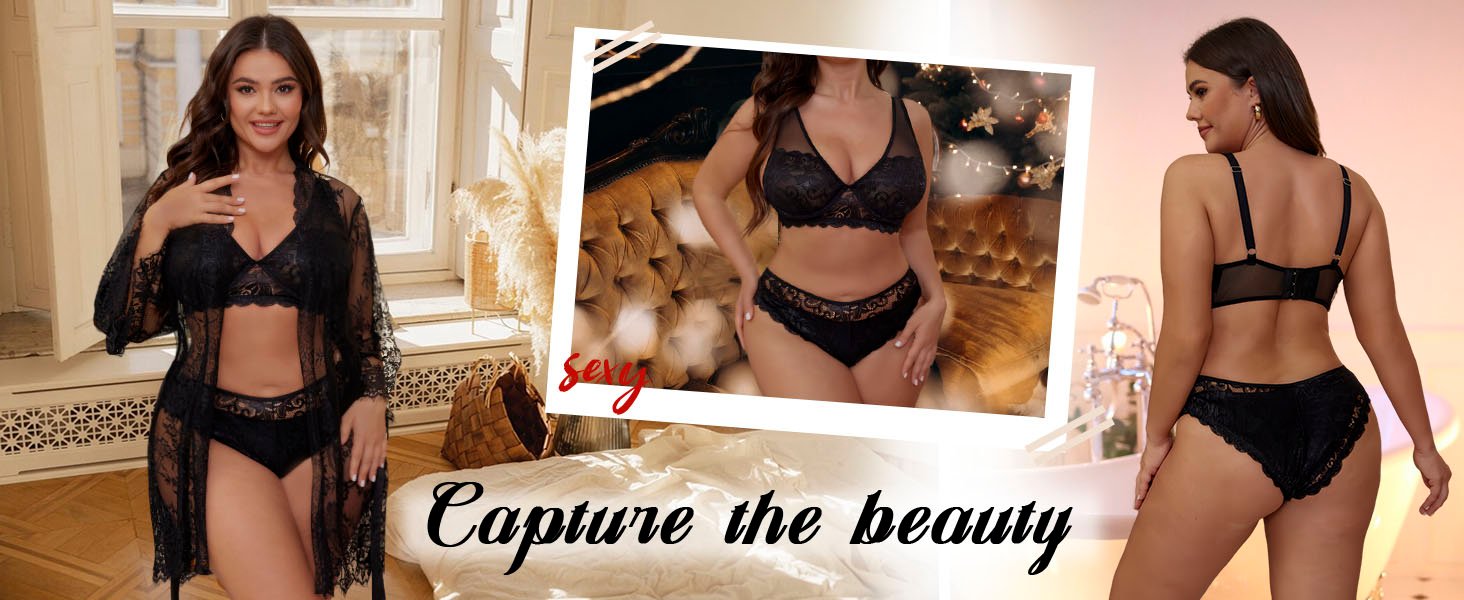 Plus Size Lingerie Set &Lace Kimono Robe &Satin Belt