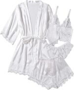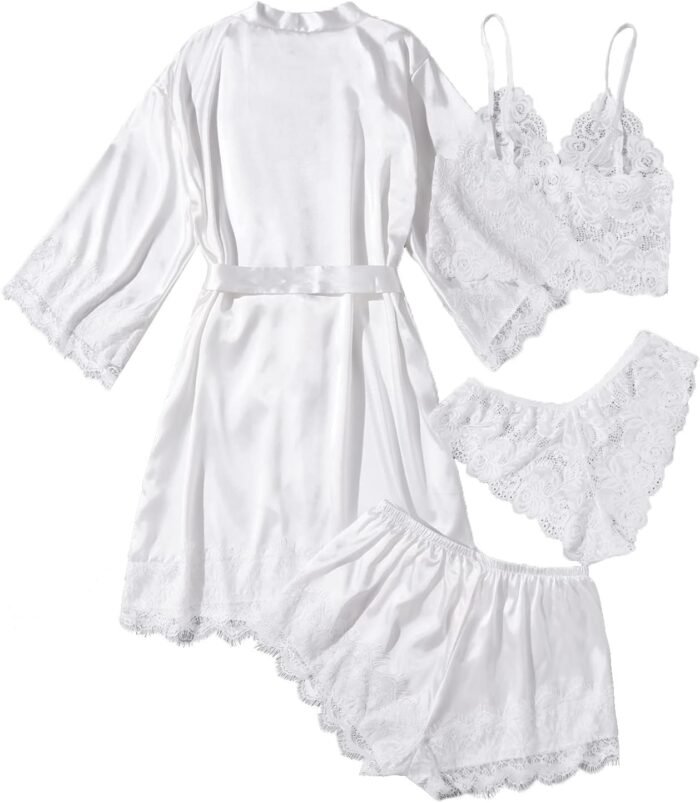 SOLY HUX Ladies’s Satin Pajama Set 4pcs Floral Lace Trim Cami Lingerie Sleepwear with Gown