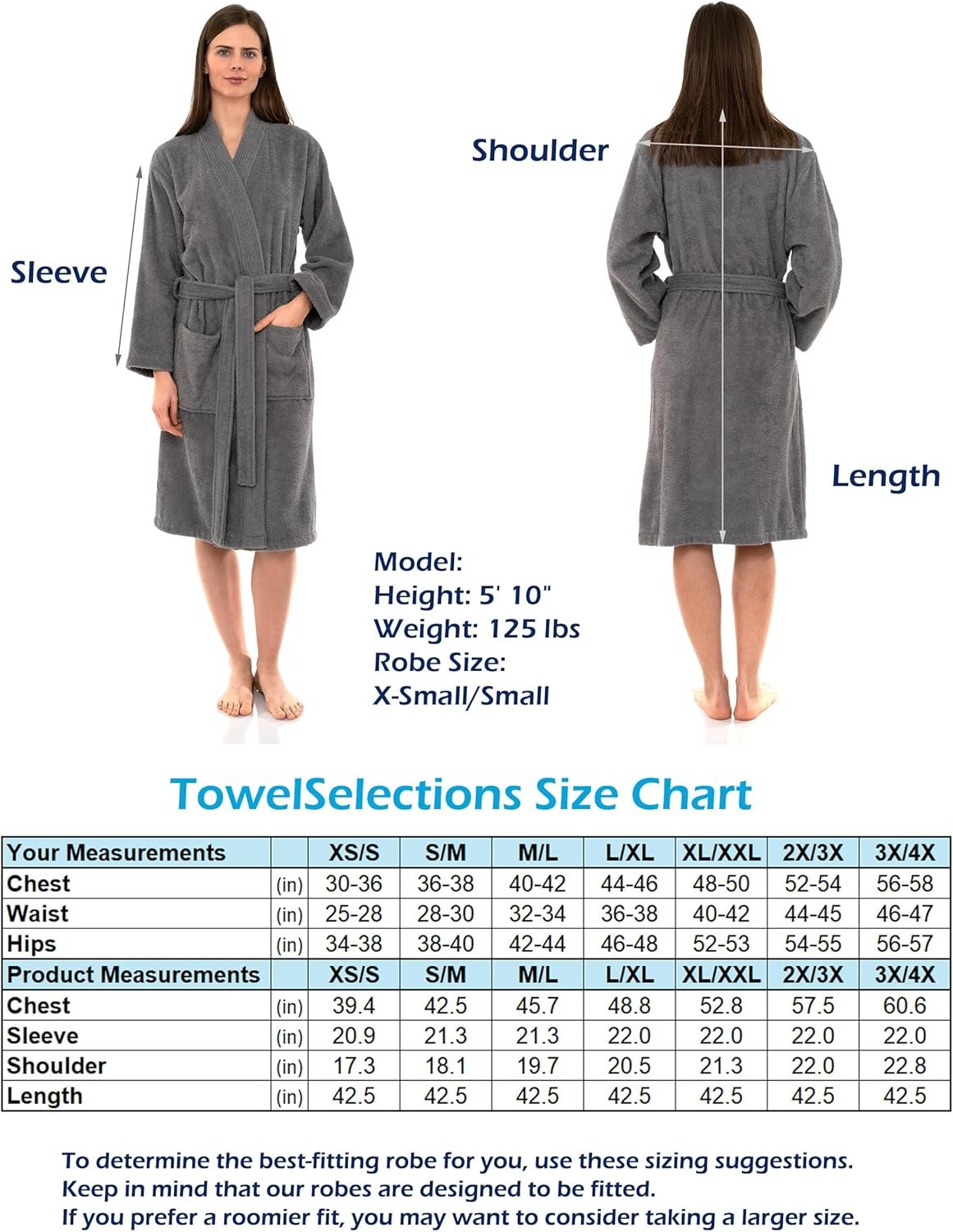 Bought this as a gift birthday gift for college bound student. So after reading the reviews, I was skeptical about this robe but here it goes.Pros:The blue color is as it is depicted on the website. Very pretty. My daughter is 4’11” and 105# so not skinny and not big, but quite short. The xs/s is slightly large but not unseemly so. It will be fine for her dorm shower. It covers all the important parts without serious gaping and is short enough to walk with confidence for one so short. The price point was perfect for her grandmother to give to her without taxing her fixed income.Cons:Luxurious it is not. I have Turkish cotton towels that are dense and soft. This is neither. While 100% cotton, it feels like a average value towel- better than a motel 8 but not a 5 star hotel. It has the thread count and weight of a big box store towel (think Walmart or Target). This was a bit of a disappointment. It did soften slightly after washing but not significantly. It also shed after its first washing, which I expected, but not significantly and no bare spots were noted. How it will hold up after multiple washings, I don’t know, but given that it is dorm bound, I doubt it gets washed all that often.Misc:The blue robe is color safe as I washed it with old white t-shirt and it came out still white. (Note: I only wash in cold water). I did not notice any shrinkage although others have. It isn’t a big issue for me in this case. It is an inexpensive robe compared to the other terry robes and the other robes at that price point or lower could be classified as more lingerie-ish than robe. Given that she is headed for colder climes, I chose one with more heft. While feeling somewhat disappointed, I think it is a decent robe at this price and for the purpose. Maybe when she graduates, grandma will spring for a really nice robe