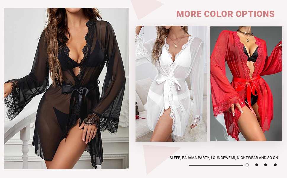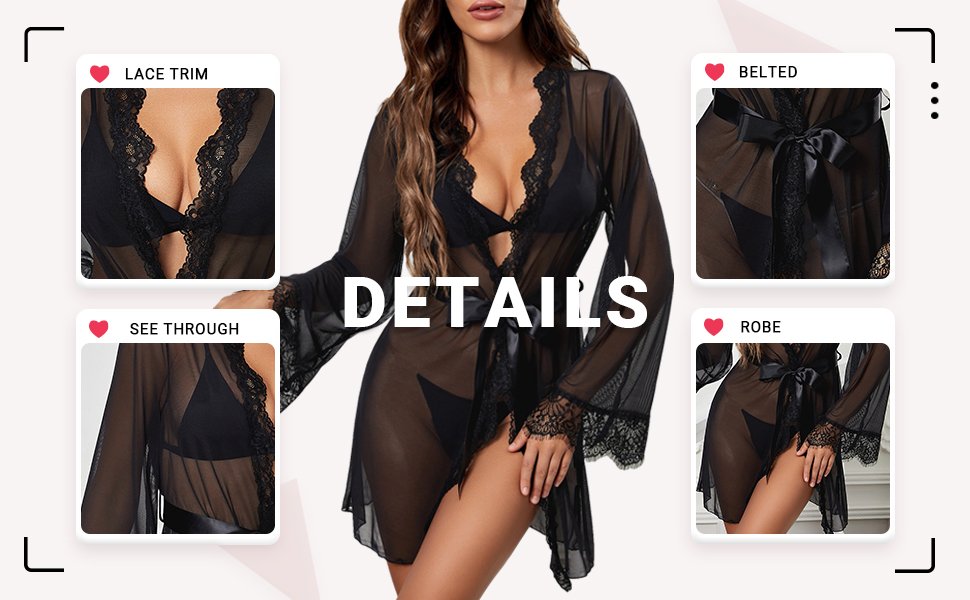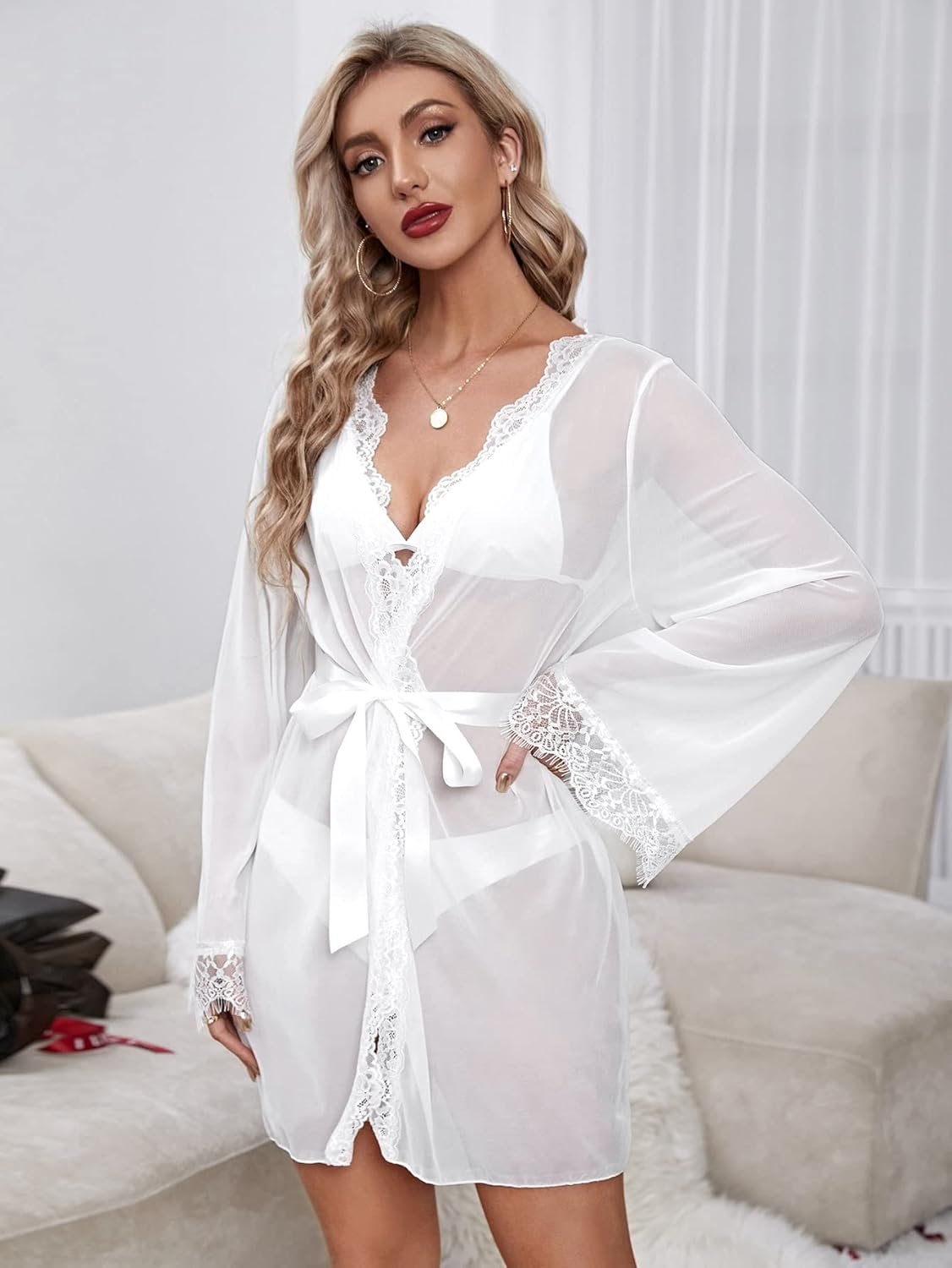 3 مراجعات لـ WDIRARA Ladies’s See By means of Lace Trim Lengthy Sleeve Belted Brief Sheer Gown Kimono