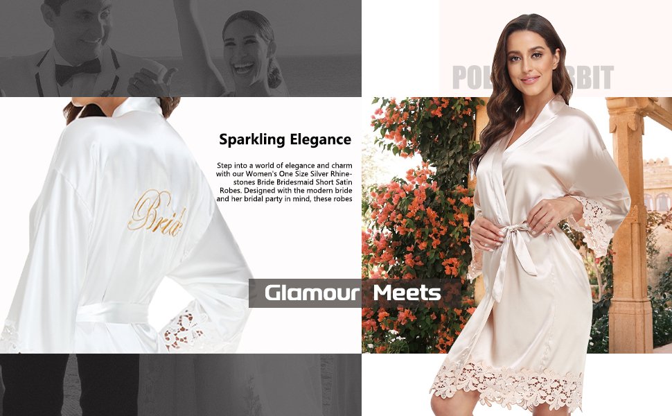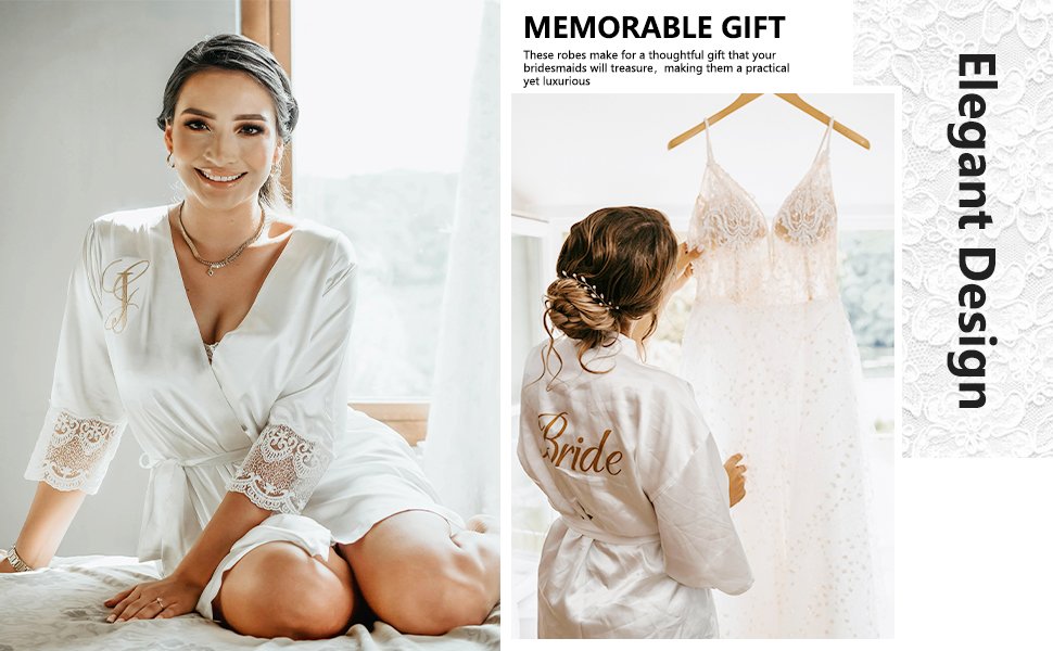 Womens Bride Bridesmaid Robes with Lace Trim Embroidery Bridal Silky Satin Bathrobe Wedding Party Sleepwear These robes are made from a mix of 97% smooth polyester and 3% spandex. They’re really soft and comfy. The spandex makes them stretchy, so they fit everyone. They’ve got pretty lace on the hem and on the sleeves, perfect for weddings. The robes have a kimono-style design, looking stylish and appealing to women. They’re made to be easy to wear and look good on everyone. The V-neck adds a bit of sexiness, and the inside ties plus a removable waist belt let you adjust it to fit perfectly, making sure it’s both comfy and stays in place. The soft, stretchy satin material makes them great for relaxing. They’re ideal for brides and bridesmaids on their wedding day and can also be used as sleepwear after the wedding. The lace and embroidery on these robes make them look fancy and perfect for a big, important day. This Women’s Bridesmaid Robes with lace and embroidery are a perfect mix of luxury, comfort, and beauty. They’re great for brides and bridesmaids who want to feel pampered, beautiful, and relaxed on the big day. Highly suggested for adding elegance to bridal party prep.