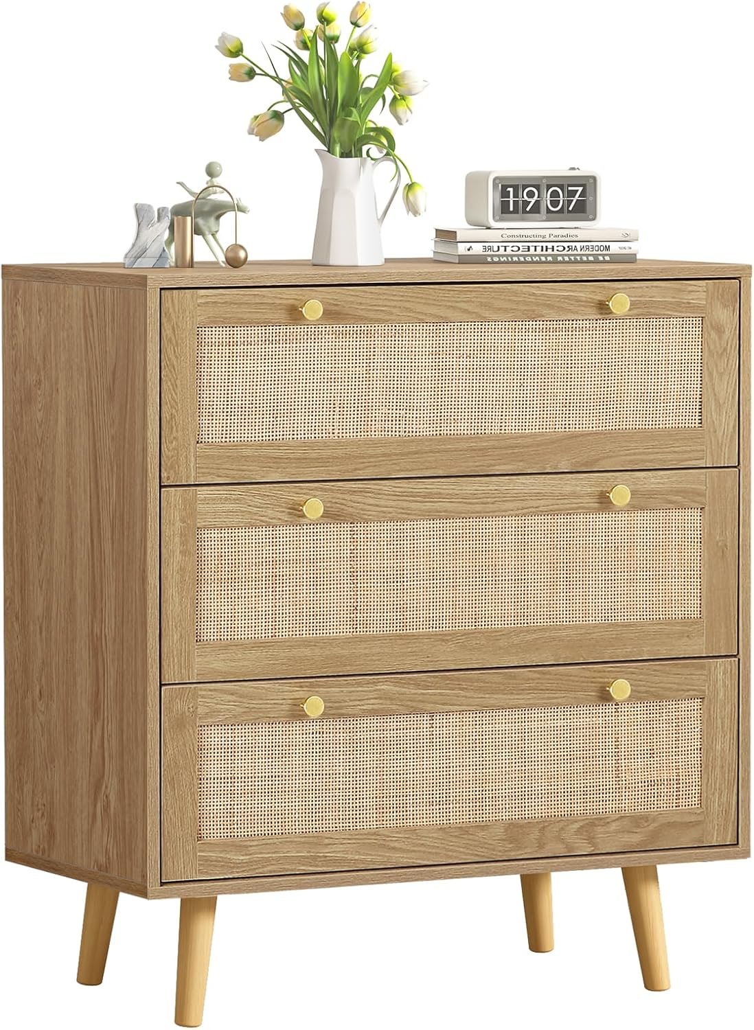 Skokliz 15.75″ D x 31.5″ W x 36″ H Rattan Large Nightstand, Rattan Cabinet Boho Night Stand Bedside Table Large 3 Drawer Nightstand/Side Table/Bedside Table for Dorm
