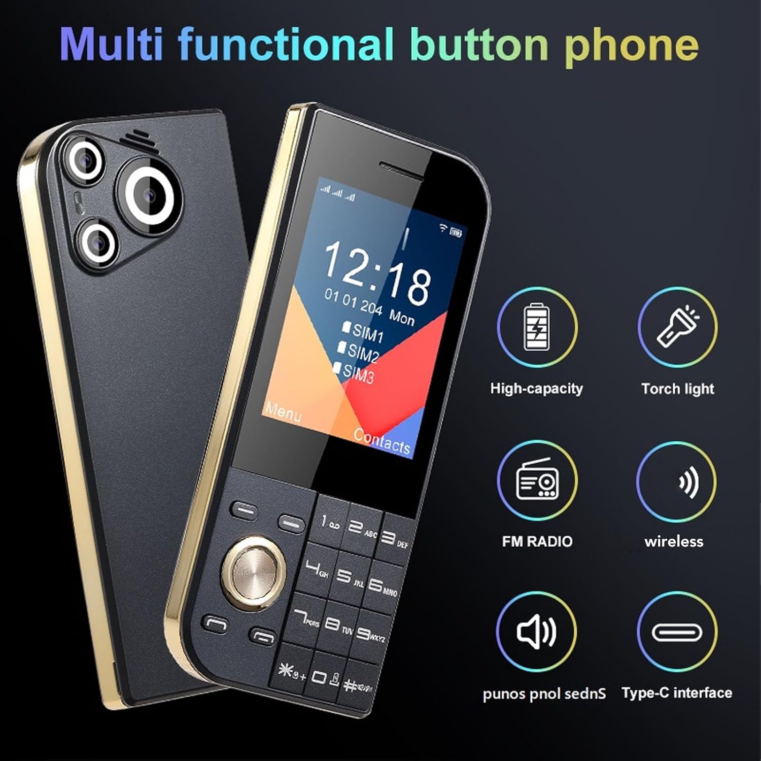 2.8 Inch Display: 2G mobile phone features 2.8 inch screen, clear and vivid colors, 3 card 3 standby feature allows you to stay connected anytime, anywhere. With a gold frame and a stylish design, this phone exudes high end sophistication.