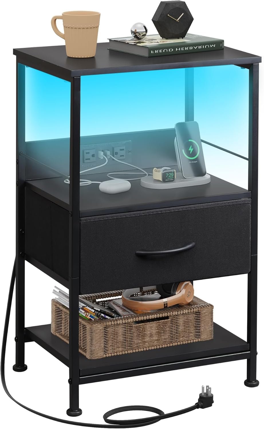 WLIVE Night Stand with Charging Station, LED Nightstand with Adjustable Fabric Drawer, 3-Tier Storage Bedside Table, Small End Side Tables for Bedroom, Black