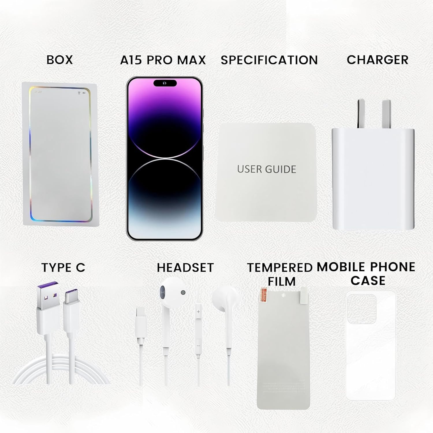 Display 6.82-inch HD smart cell phoneBattery: 6800mAhMemory: 8+256GB Super MemoryA15 Pro Max Weight: 380 gramsCamera 108MP Rear Camera + 50MP Front CameraProcessor: Dimensity 1080 10-core processorWi-Fi: 5G/4G/3G